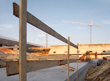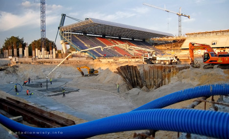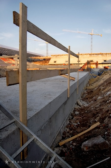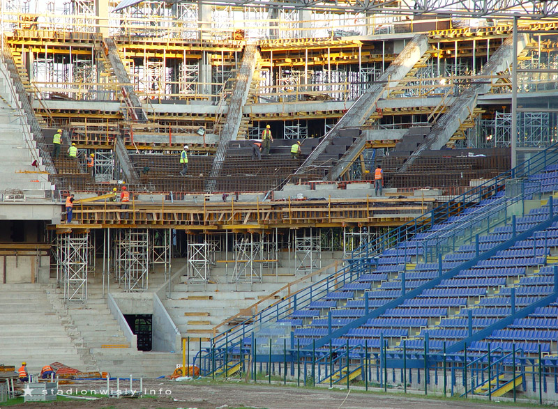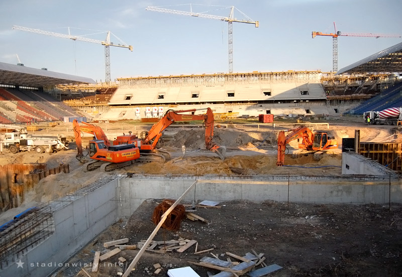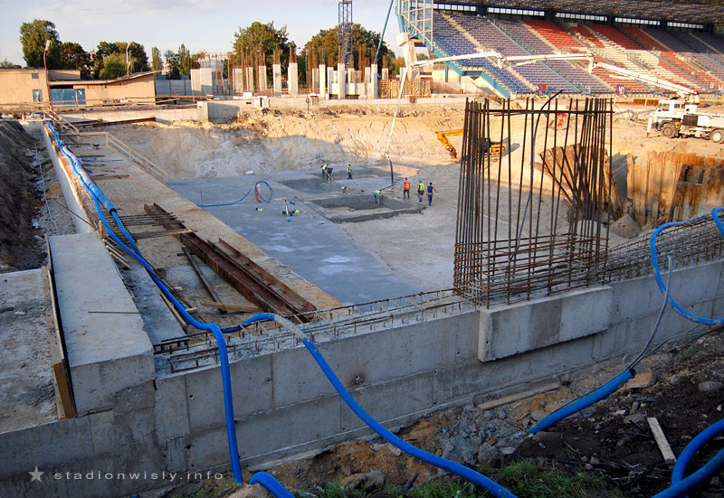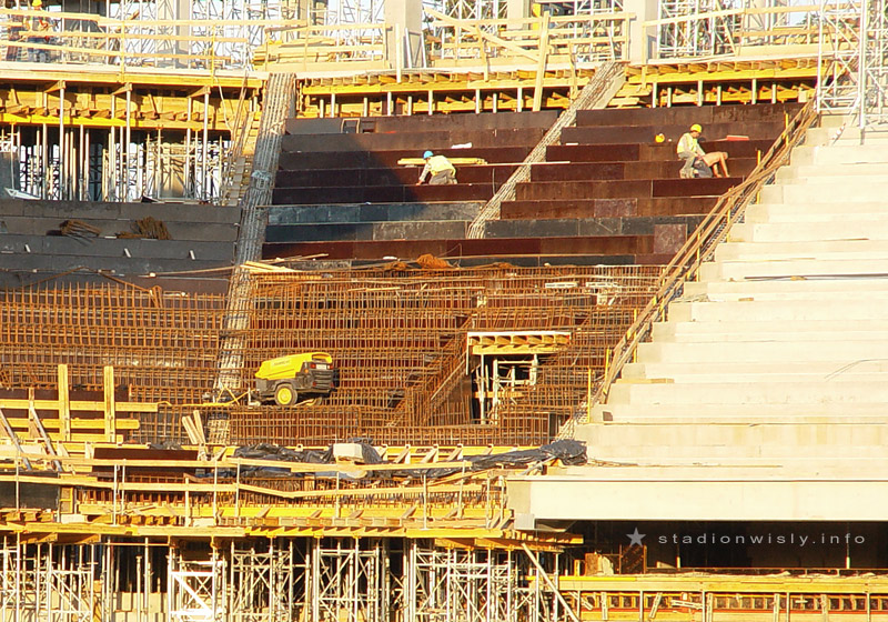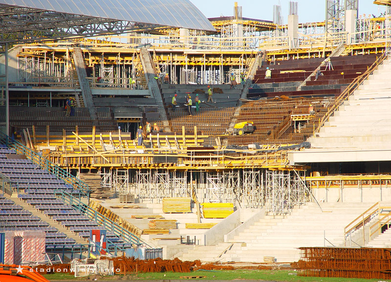 Zgodnie z zapowiedziami po zachodniej stronie budowy pojawił się pierwszy chudy beton. Widoczne na zdjęciach wgłębienia oznaczają, iż w tych miejscach staną słupy nośne. Duże postępy widać także na trybunach narożnych. W połowie gotowe są już szalunki oraz zbrojenia przyszłych stopnic.