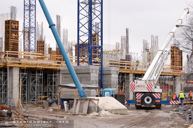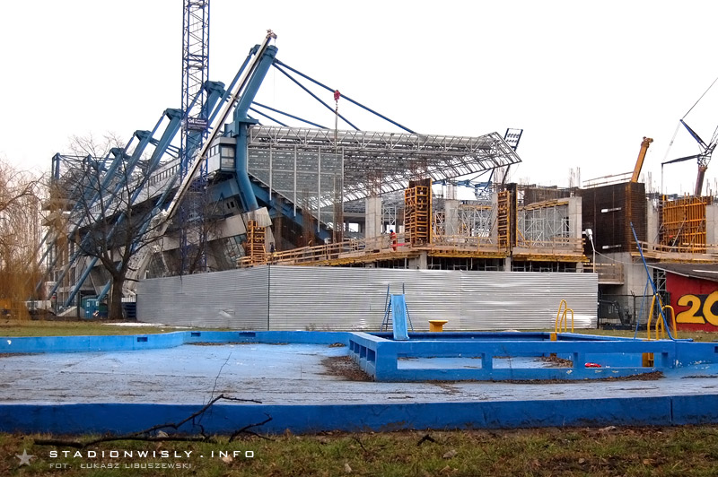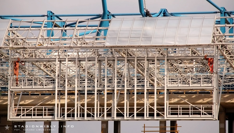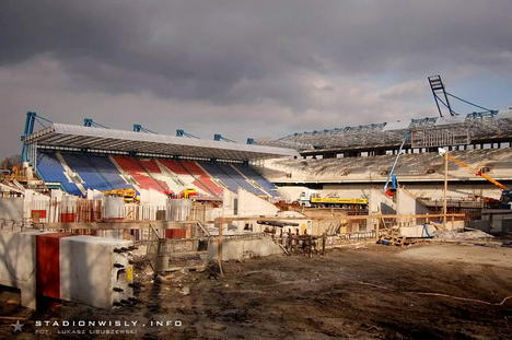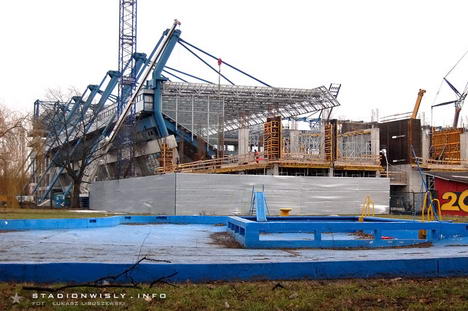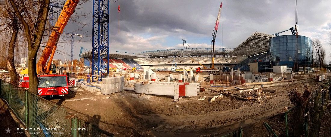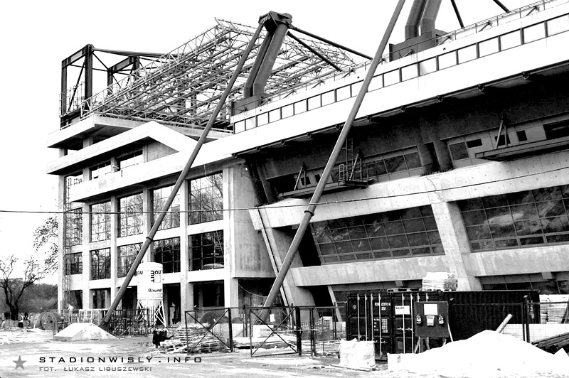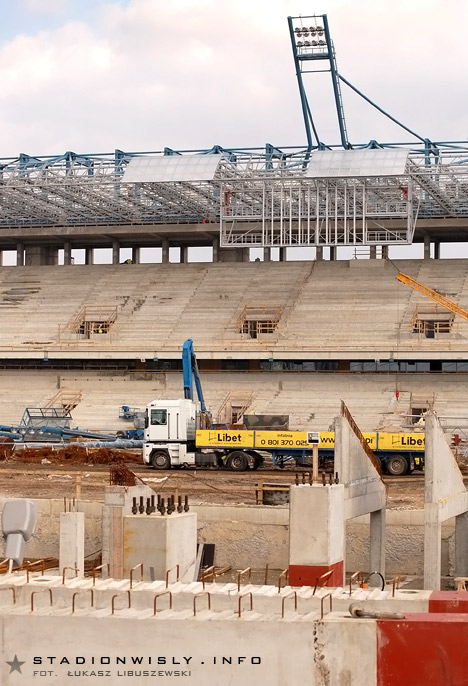 W strefie trybuny zachodniej póki co nie ma wielkiego ruchu. Prace ograniczają się głównie do układania kolejnych prefabrykowanych filarów. Tradycyjnie już najwięcej dzieje się przy budowie narożnika północno - zachodniego. Obecnie trwają tam prace na poziomie drugiej kondygnacji naziemnej. Układane są kolejne szalunki, gdzie wylewany jest beton pod filary, oraz ściany. Dodatkowo cały czas na teren budowy zwożone są różne materiały, a to znak iż budowa w niedługim czasie nabierze rozmachu.