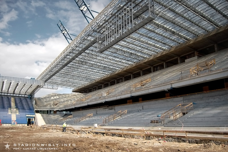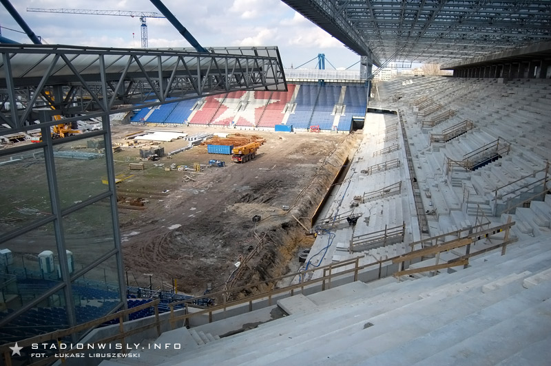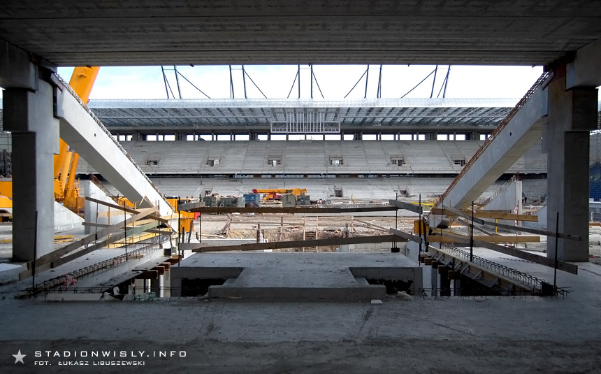 Mimo soboty ruch na budowie był dość spory. Po zachodniej stronie prace dotarły już na poziom przyszłych loży VIP. Nad tą częścią zamontowane zostały także belki pod kolejny strop Na zewnątrz obiektu trwa budowa klatek schodowych, gdzie wylano kolejne części schodów. Wczoraj natomiast rozpoczęto montaż pierwszych rzędów nowej trybuny. Do tej pory położono 6 prefabrykowanych segmentów (po 2 stopnie każdy).