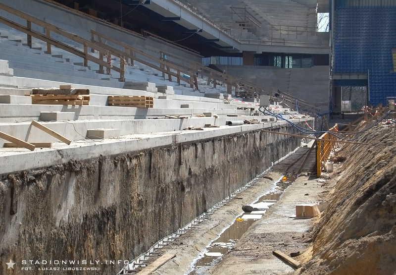 Przed trybuną wschodnią, wybrano już całą ziemię pod przyszłą fosę oddzielająca widownię od boiska. Teraz przyszedł czas na zazbrojenie i oszalowanie konstrukcji.
