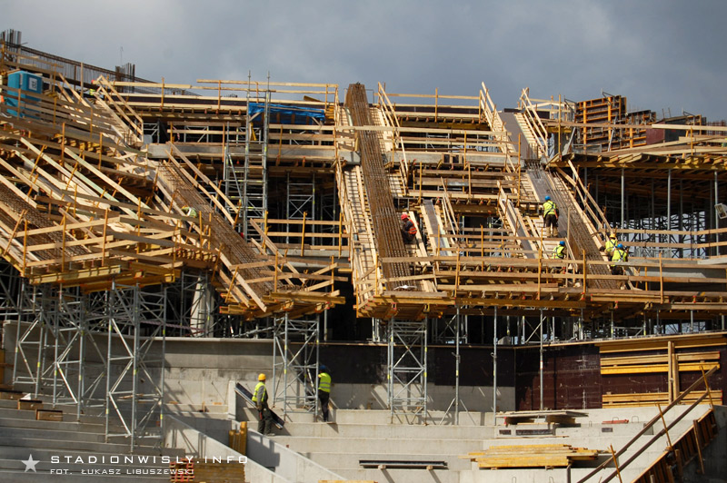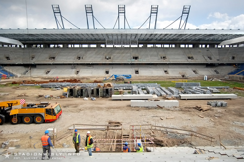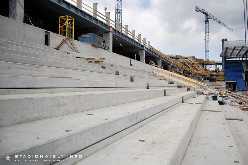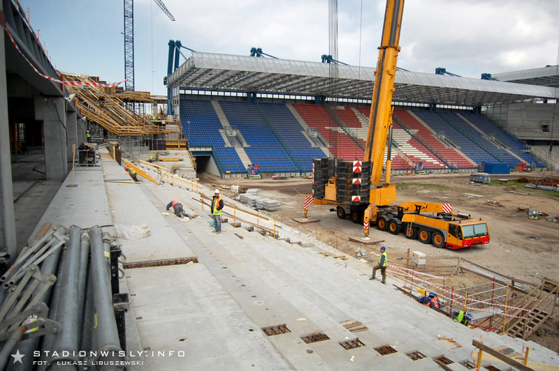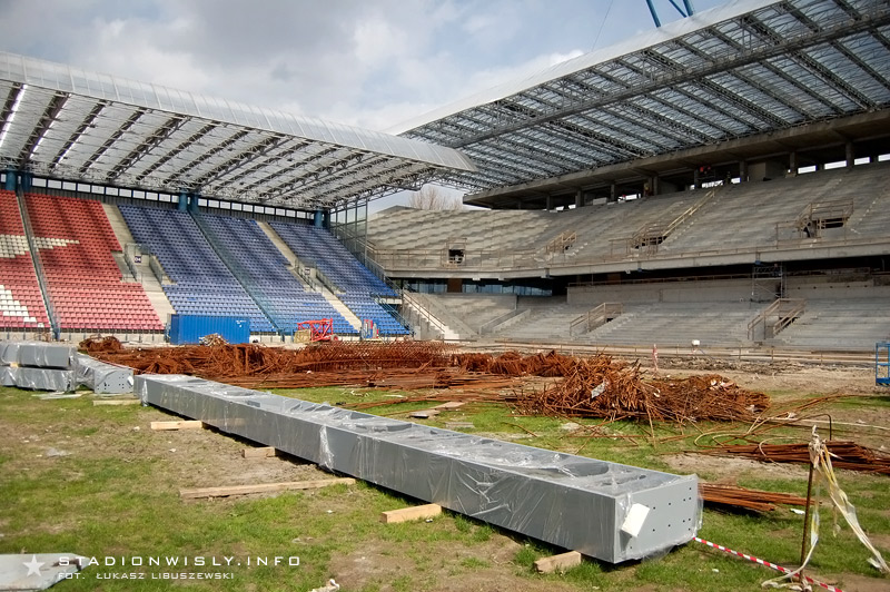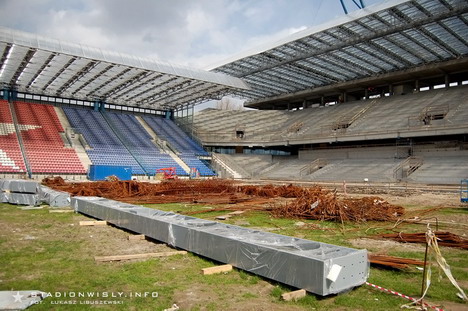 Na dolnym poziomie trybuny głównej położono już wszystkie prefabrykaty (stopnice, podest loży VIP). Obecnie trwają prace przy wypełnianiu szczelin między stopnicami. Równolegle wykańczane są także wejścia na trybunę. Od wtorku rozpoczęto układanie filarów oraz belek stężających na których wsparty zostanie (między innymi) balkon nowej trybuny. Do końca kwietnia wszystkie słupy powinny zostać ułożone. Prawdopodobnie jeszcze w przyszłym tygodniu rozpocznie się montaż rygli na których wsparty zostanie drugi poziom trybuny.