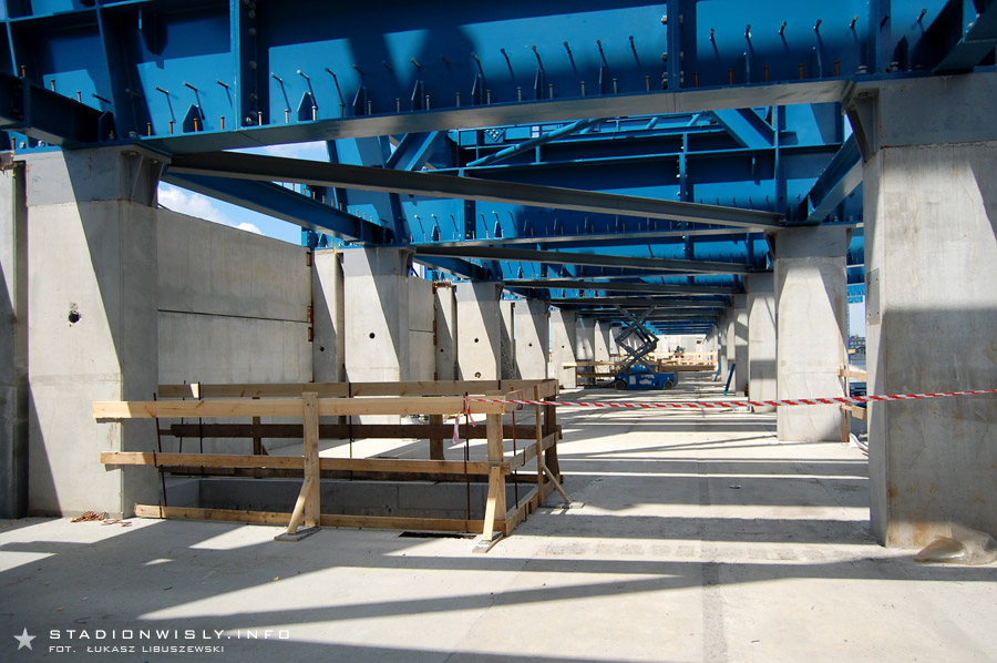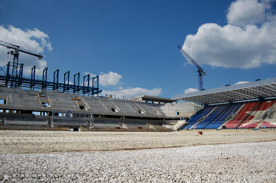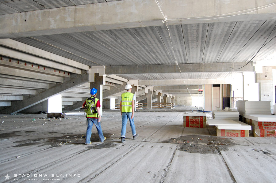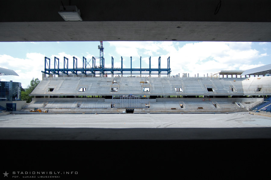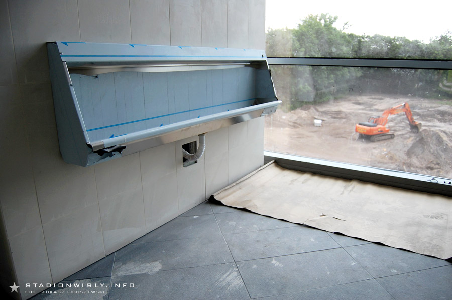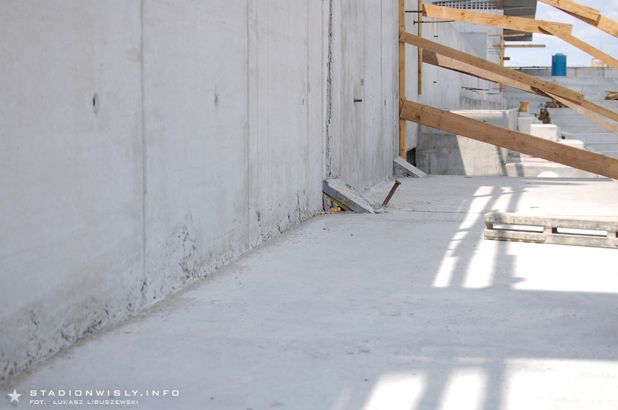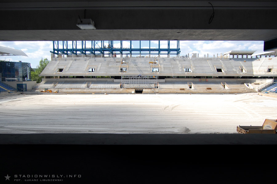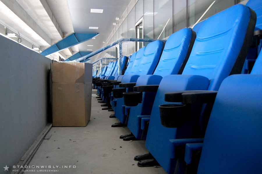 Prace wykończeniowe pod trybuną wschodnią powoli dobiegają końca. Niemal gotowe są już wszystkie łazienki, oraz klatki schodowe. W niektórych pomieszczeniach brakuje jeszcze wykończenia posadzek lub sufitów. Prac do końca zostało niewiele, więc na 12 lipca zaplanowano wejście ekipy sprzątającej. Przy Sky-boxa pojawiły się fotele VIP. Co prawda nie są jeszcze przymocowane, ale można już z nich zobaczyć jaki mniej więcej będzie widok na boisko. I tu niestety projektanci się nie popisali. O ile z górnego rzędu jest względnie dobry widok na boisko, to z dolnego dolnego foteli trzeba się wychylić aby zobaczyć je w całości. Widok z loży VIP można zobaczyć na samym dole galerii..