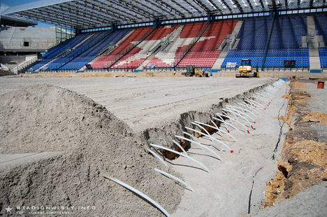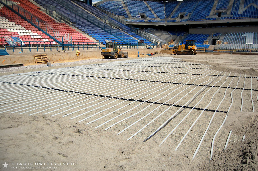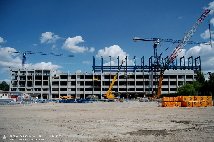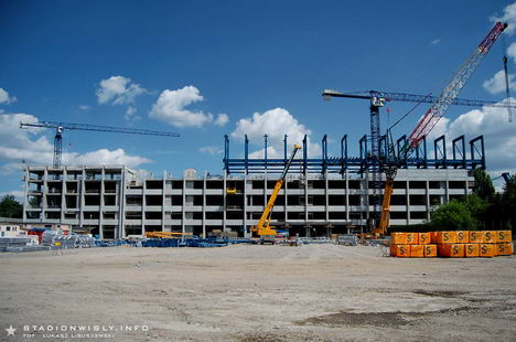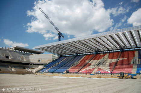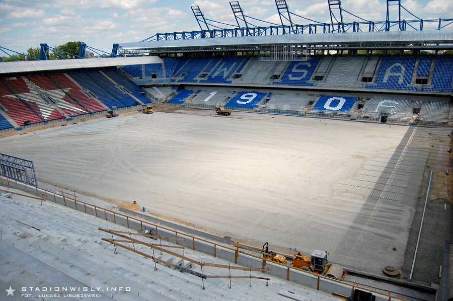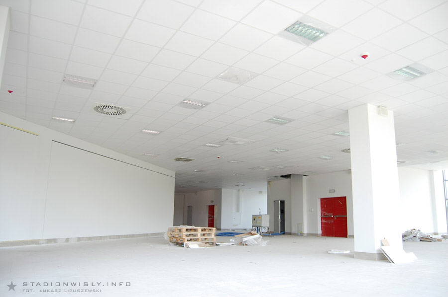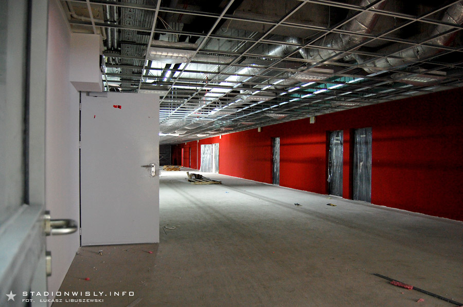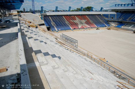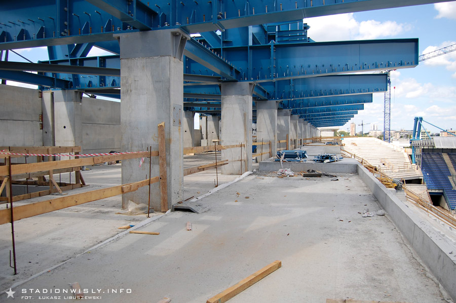 Prace wykończeniowe pod trybuną wschodnią powoli dobiegają końca. Niemal gotowe są już wszystkie łazienki, oraz klatki schodowe. W niektórych pomieszczeniach brakuje jeszcze wykończenia posadzek lub sufitów. Prac do końca zostało niewiele, więc na 12 lipca zaplanowano wejście ekipy sprzątającej. Przy Sky-boxa pojawiły się fotele VIP. Co prawda nie są jeszcze przymocowane, ale można już z nich zobaczyć jaki mniej więcej będzie widok na boisko. I tu niestety projektanci się nie popisali. O ile z górnego rzędu jest względnie dobry widok na boisko, to z dolnego dolnego foteli trzeba się wychylić aby zobaczyć je w całości. Widok z loży VIP można zobaczyć na samym dole galerii..