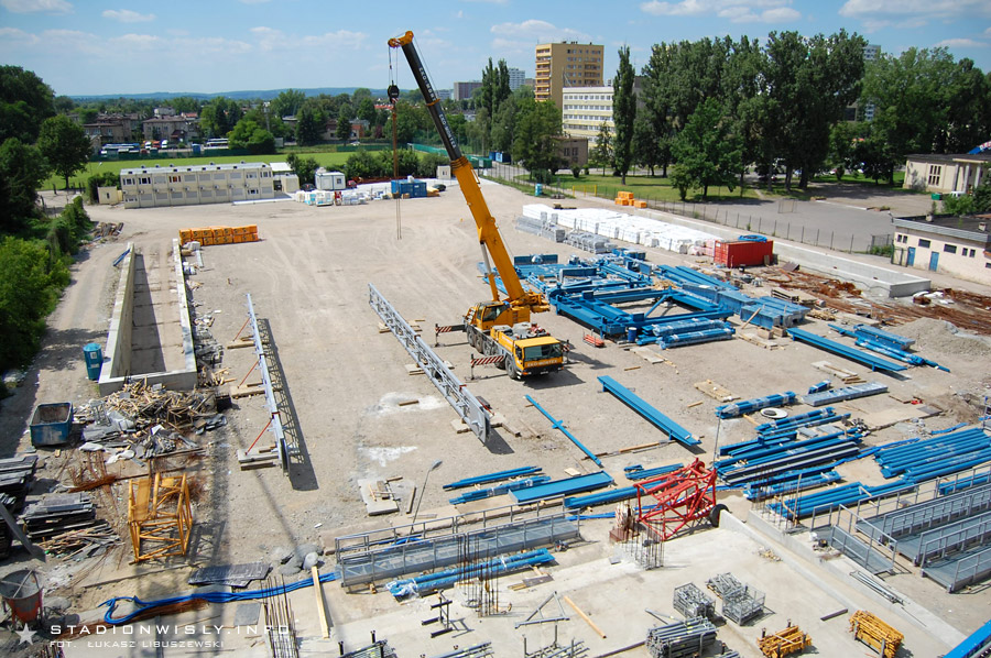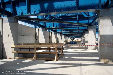 Od zachodniej strony rozpoczął się już montaż dźwigarów dachowych. Pierwszy złożony segment najprawdopodobniej w przyszłym tygodniu znajdzie się nad trybuną.