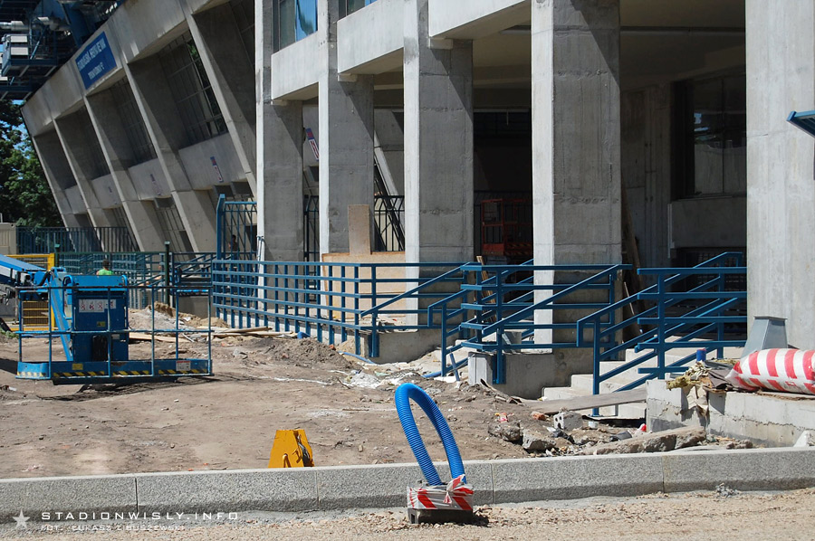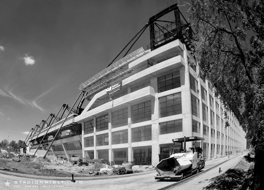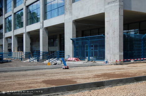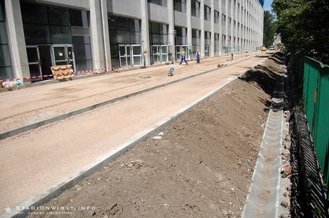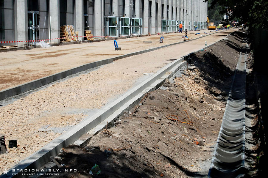 Wzdłuż trybuny wschodniej gotowa jest już nawierzchnia na której w najbliższą sobotę lub poniedziałek rozpocznie się wylewanie asfaltu. Będzie on składał się z 3 warstw o łącznej grubości 16 cm. Dodatkowo w pasie przeznaczonym na ścieżkę rowerową asfalt będzie barwiony na kolor czerwony. Całość prac powinna zakończyć się za około 2 tyg.