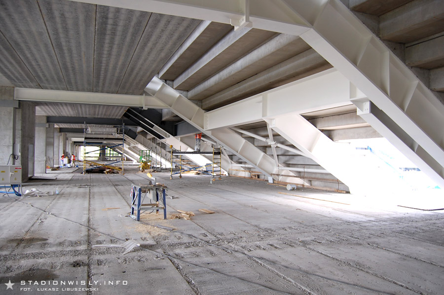 Prace wykończeniowe pod trybuną wschodnią powoli dobiegają końca. Niemal gotowe są już wszystkie łazienki, oraz klatki schodowe. W niektórych pomieszczeniach brakuje jeszcze wykończenia posadzek lub sufitów. Prac do końca zostało niewiele, więc na 12 lipca zaplanowano wejście ekipy sprzątającej. Przy Sky-boxa pojawiły się fotele VIP. Co prawda nie są jeszcze przymocowane, ale można już z nich zobaczyć jaki mniej więcej będzie widok na boisko. I tu niestety projektanci się nie popisali. O ile z górnego rzędu jest względnie dobry widok na boisko, to z dolnego dolnego foteli trzeba się wychylić aby zobaczyć je w całości. Widok z loży VIP można zobaczyć na samym dole galerii..